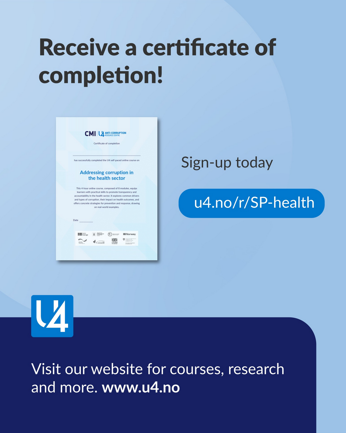 U4 partner staff and anyone working in health systems, policy, or governance are welcome to take this flexible course at any time. As one of the most persistent and complex challenges in global health, corruption must be understood before we can address it through practical tools, better governance, and systemic thinking.