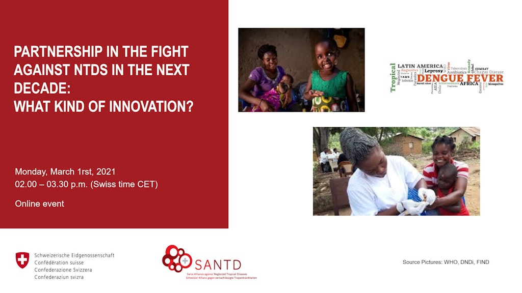 March 1, 2021 – The Swiss Alliance against Neglected Tropical Diseases (SANTD), in collaboration with SDC, held a webinar on the transition from a disease-specific approach to cross-cutting collaborations in fighting against Neglected Tropical Diseases (NTDs), highlighting the importance of health determinants and innovation. Partners from different sectors shared their experiences, followed by a panel discussion on approaches and innovations for more intersectoral interventions in the fight against NTDs.