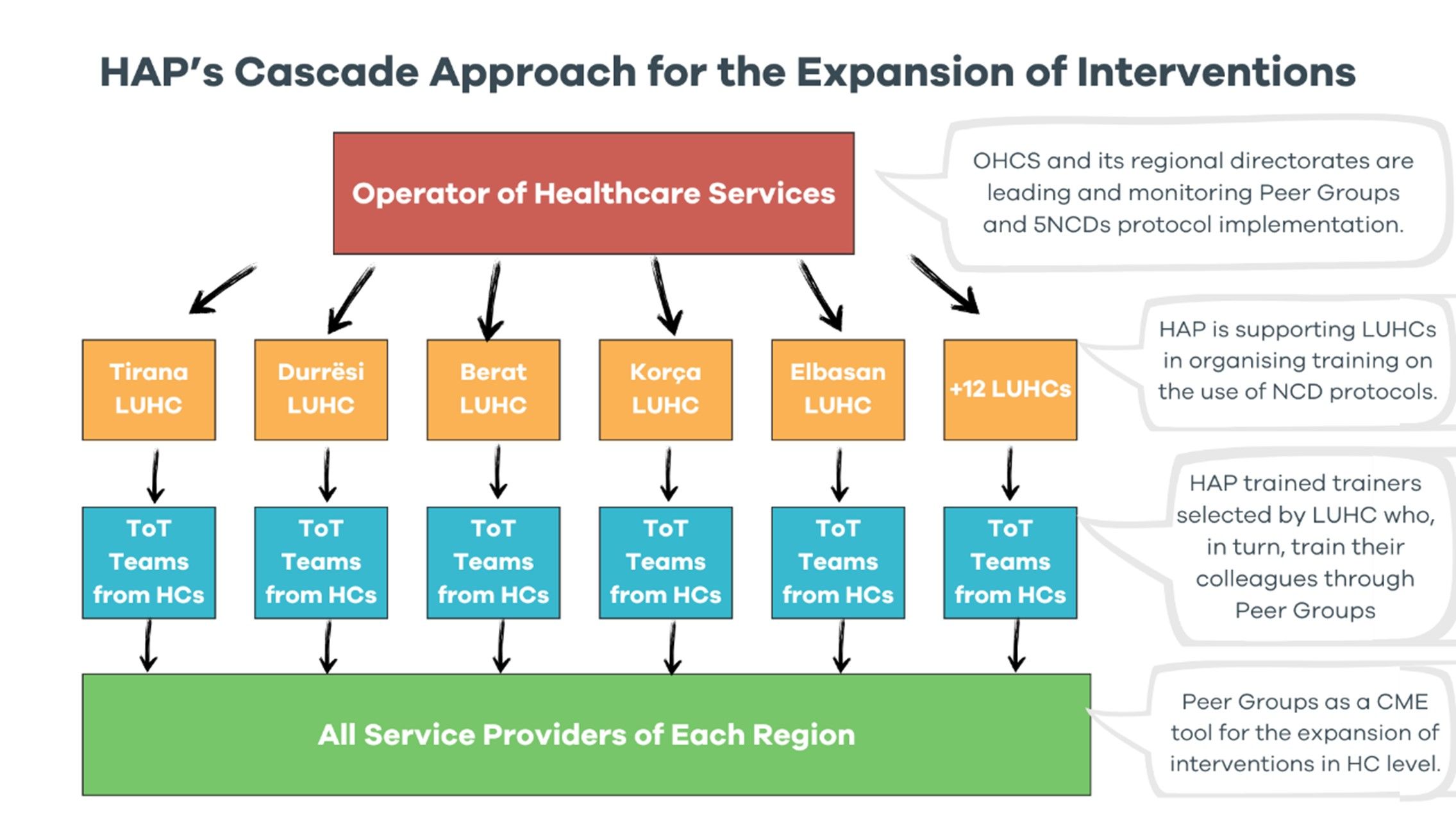 The expansion of interventions was accomplished in close cooperation with the Operator of Health Care Services, its regional entities, and Local Units of Health Care (LUHCs) by adopting a cascade approach. Practically, HAP supports LUHCs in the implementation of NCDs clinical guidelines and protocols by providing training-of-trainer sessions for a critical mass of trainers who, in turn, continue to train their colleagues through Peer Groups, a continuing education tool introduced and strengthened by HAP. Between 2022 and 2024, HAP facilitated the training of 985 healthcare professionals, including general practitioners and nurses, in evidence-based NCD management protocols. This accounts for 17.5% of PHC providers in project areas. 1,424 professionals (25,2% of the total number of PHC providers) have participated in Peer Groups in the last two years alone, fostering peer learning and widespread adoption of best practices regarding the prevention and management of NCDs.